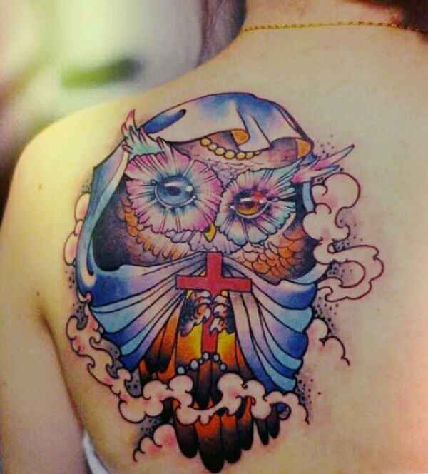 背部拿着十字架的猫头鹰纹身