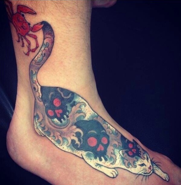 脚背上骷髅花纹的猫咪纹身