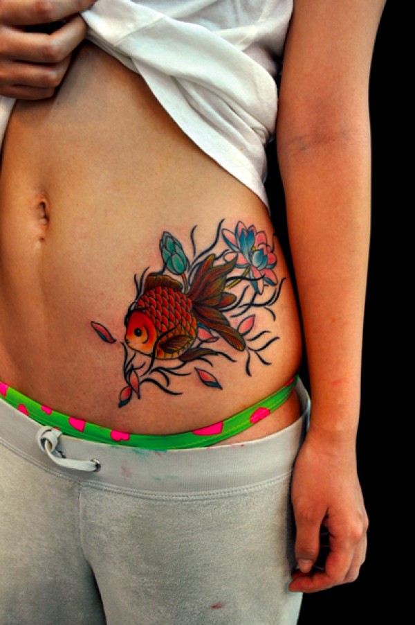女生腹部可爱的金鱼纹身图案