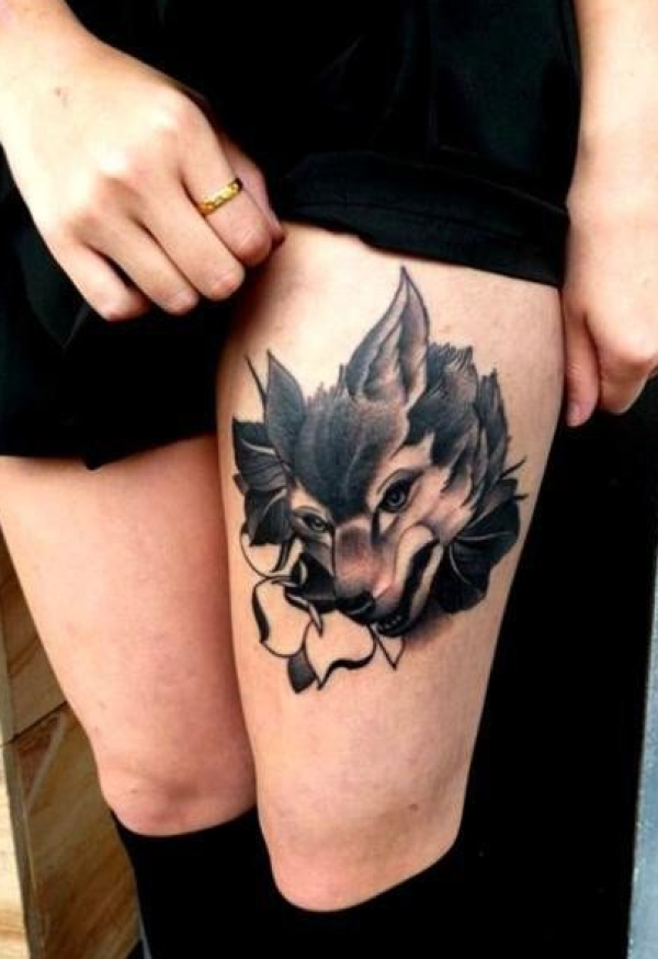 大腿上潮流性感狼头纹身图片