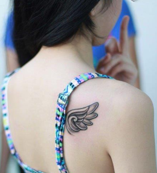 靓妹肩背小巧唯美的小翅膀纹身图案