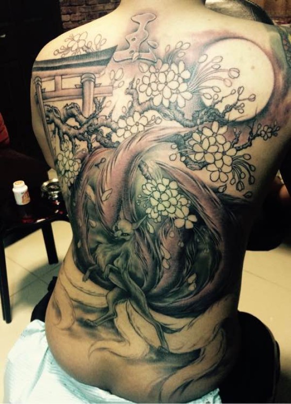 满背好看的樱花九尾狐纹身
