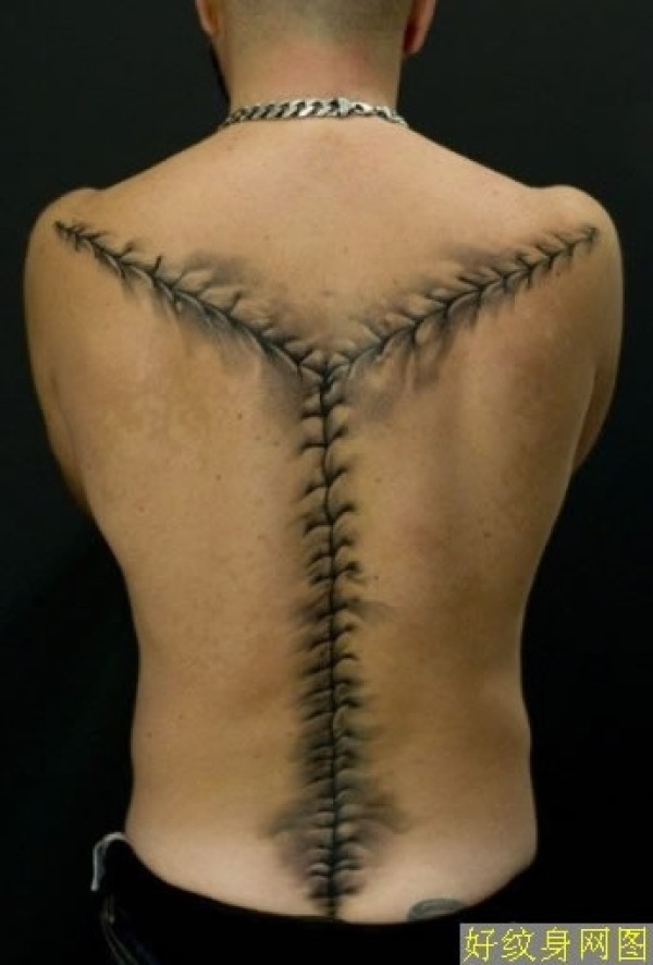 后背上的Y字形缝针图案3d纹身这样真实的伤口3_3D纹身图案大全_纹身图吧