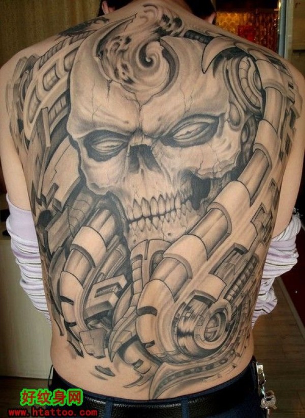 男性满背黑白3D机械骷髅纹身图案_3D纹身图案大全_纹身图吧