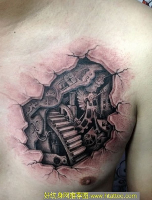 胸部毁皮下的机械图案3D纹身图片将胸部的肌肤刻_3D纹身图案大全_纹身图吧
