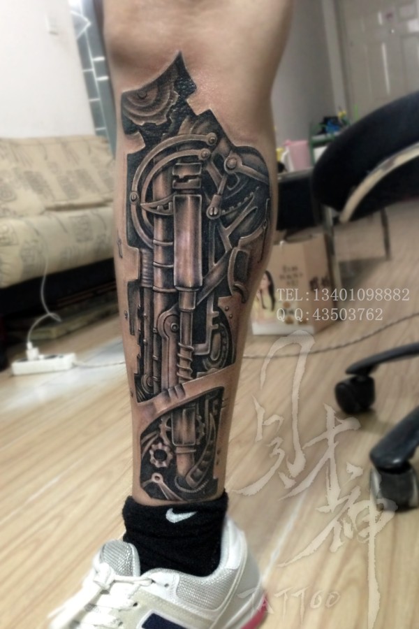 小腿上逼真的机械图案3D纹身纹身图案使小腿看起_3D纹身图案大全_纹身图吧