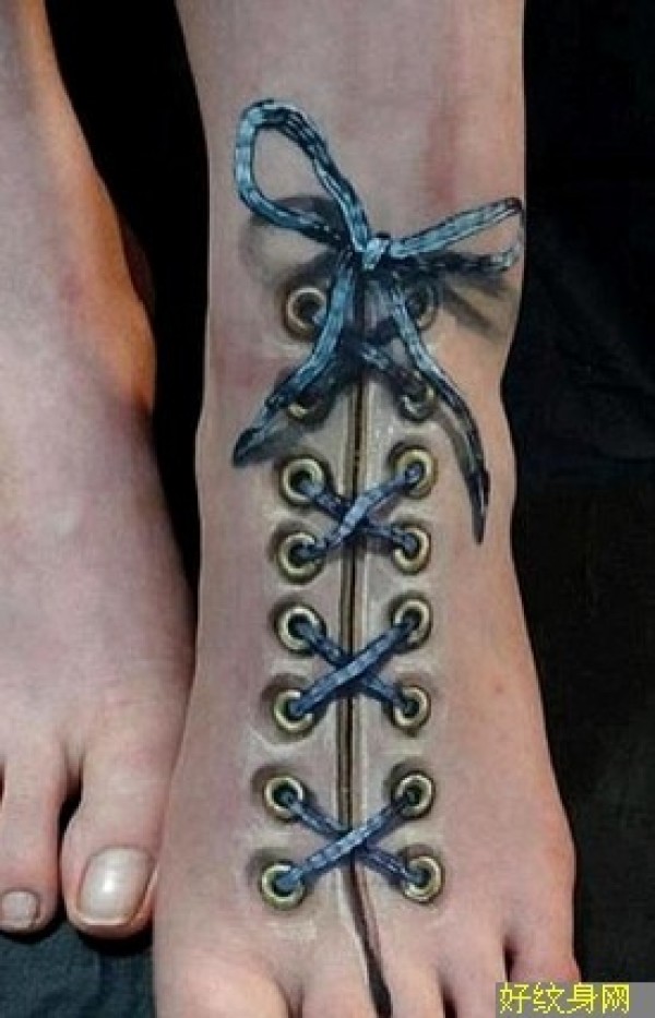 脚背上非常逼真的3D纹身图案脚背上的鞋带图案_3D纹身图案大全_纹身图吧