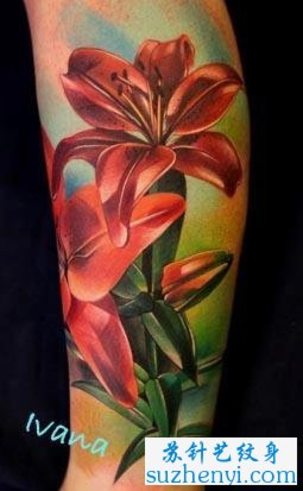 腿部彩色3D花卉纹身_3D纹身图案大全_纹身图吧