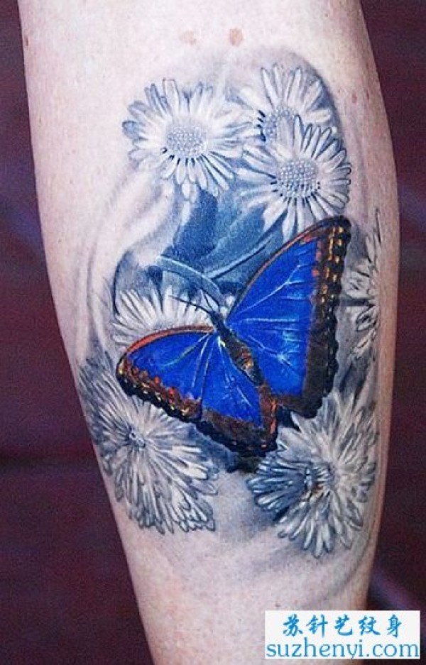 腿部彩色3D蝴蝶花卉纹身_3D纹身图案大全_纹身图吧