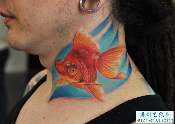 颈部3D彩色小金鱼纹身_3D纹身图案大全_纹身图吧