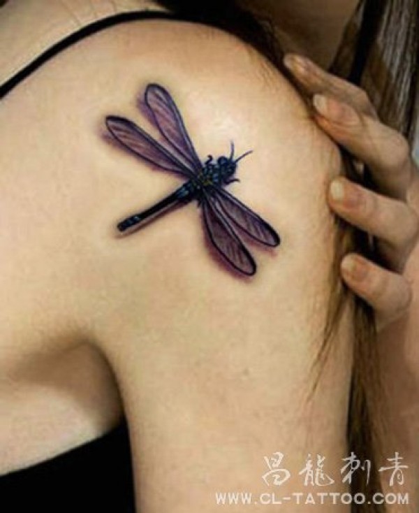肩部3D立体蜻蜓刺青作品_女生彩色_3D纹身图案大全_纹身图吧