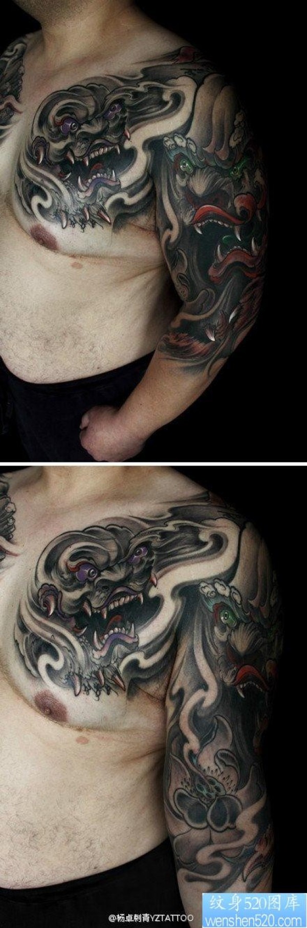 推荐超帅很酷的一幅半甲唐狮子纹身图片图片作_半甲纹身图案大全_纹身图吧