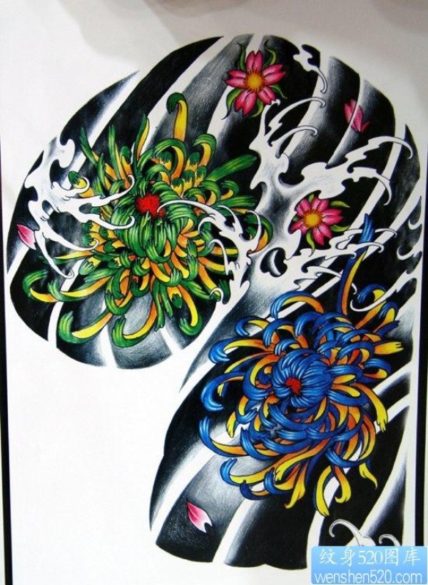 中国经典的传统半甲菊花纹身手稿图片展示_半甲纹身图案大全_纹身图吧