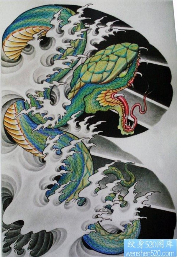 推荐一幅传统纹身图片之潮流超酷的半甲蛇浪花_半甲纹身图案大全_纹身图吧