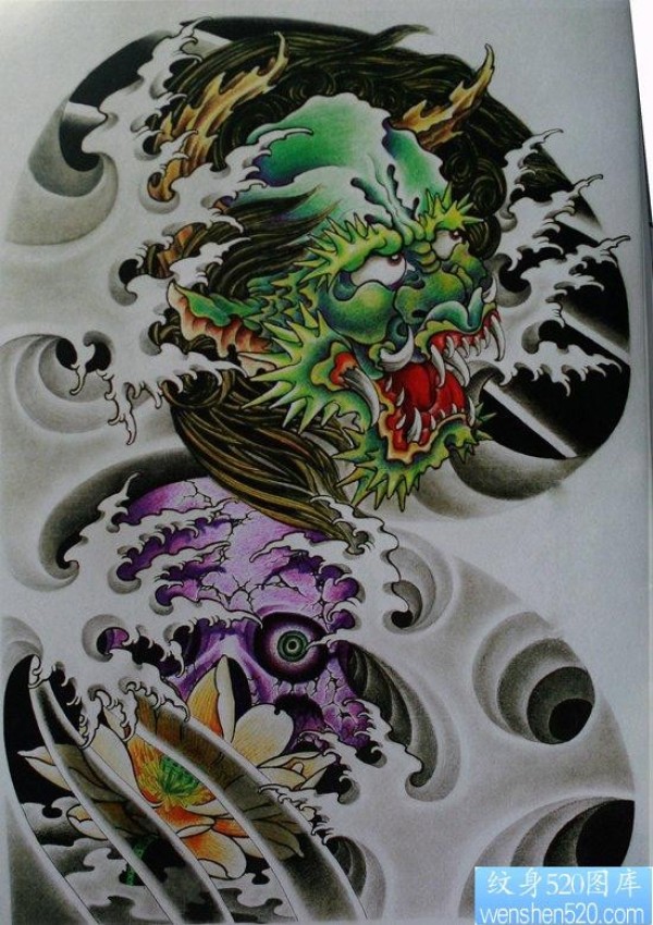 中国经典纹身手稿之霸气超酷的半甲龙头骷髅莲_半甲纹身图案大全_纹身图吧