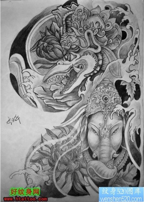 一幅潮流很酷的半甲佛头与象神纹身图片图片推_半甲纹身图案大全_纹身图吧