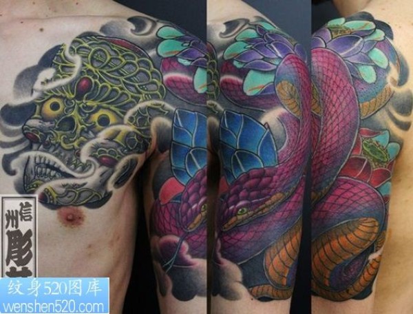 嘎巴拉大蛇莲花半甲纹身图案_半甲纹身图案大全_纹身图吧