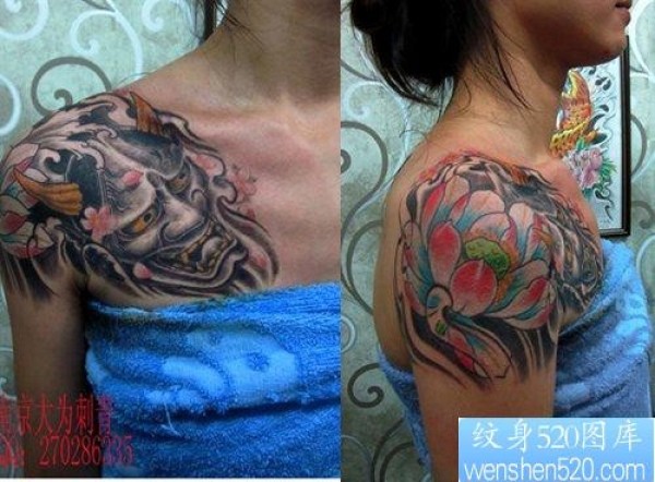 南京纹身图片展示一幅美女的半甲般若与莲花_半甲纹身图案大全_纹身图吧