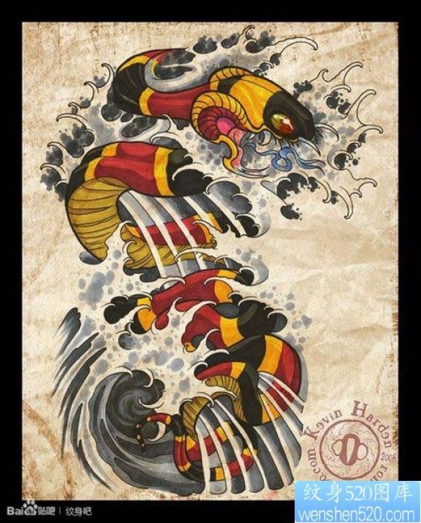 一幅经典帅气的日式老传统半甲蛇纹身手稿图片_半甲纹身图案大全_纹身图吧