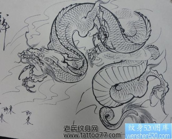 龙纹身手稿_一组老传统黑灰龙手稿纹身图案