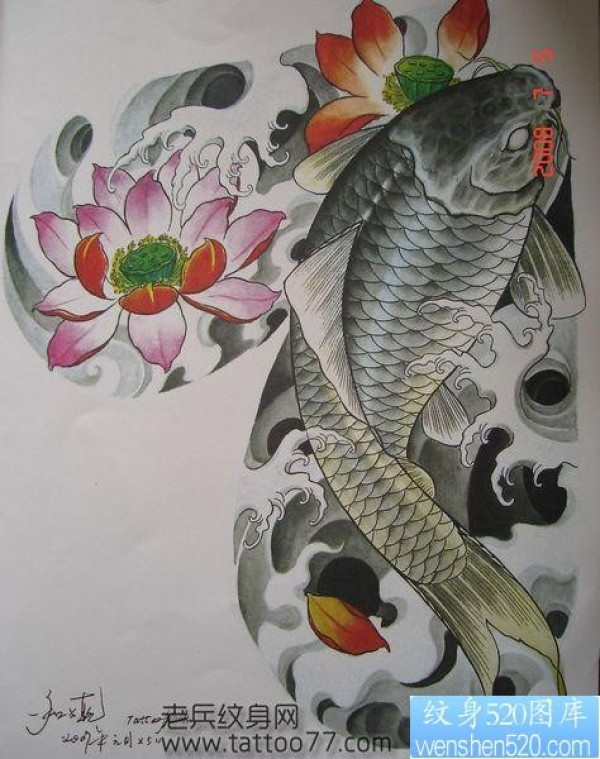 简单的半甲鲤鱼莲花纹身手稿_半甲纹身图案大全_纹身图吧