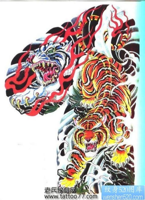 超帅很酷的一幅半甲老虎追日纹身图片图片_半甲纹身图案大全_纹身图吧