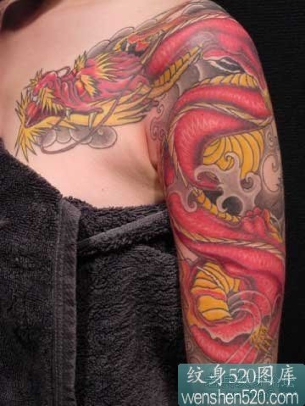 红色的披肩龙半甲纹身作品欣赏_半甲纹身图案大全_纹身图吧