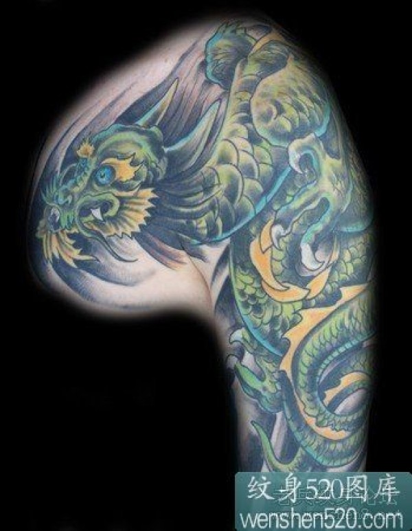 肩部青色披肩龙半甲纹身_半甲纹身图案大全_纹身图吧