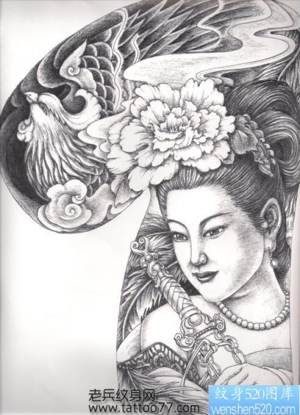 半甲纹身手稿半甲美女凤凰纹身手稿_半甲纹身图案大全_纹身图吧