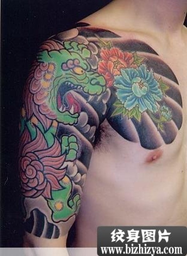 右手臂上的半甲狮头和花朵纹身作品_半甲纹身图案大全_纹身图吧