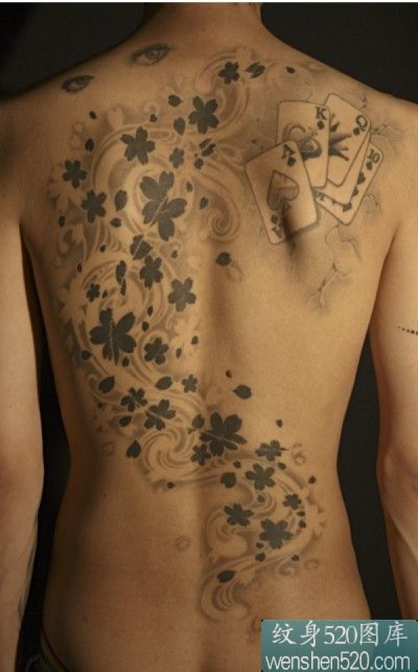 女性后背樱花和纸牌纹身_后背纹身图案大全_纹身图吧