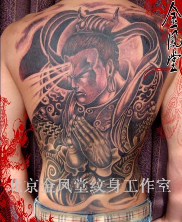 满背红色二郎神杨戬刺青作品_后背纹身图案大全_纹身图吧