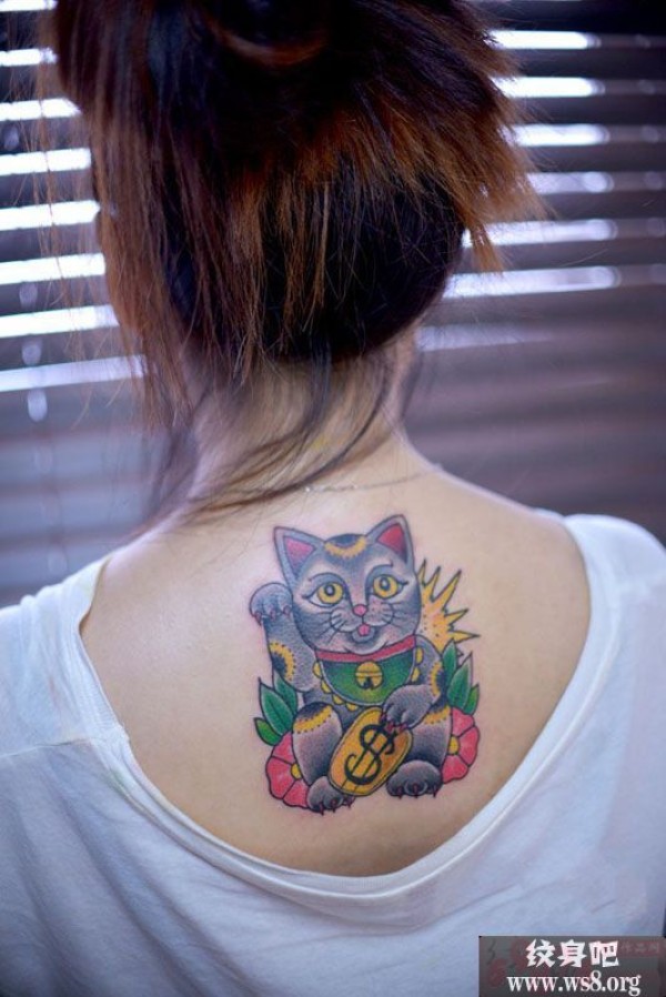 女性后背上面的可爱招财猫keaizhaocaimao_后背纹身图案大全_纹身图吧