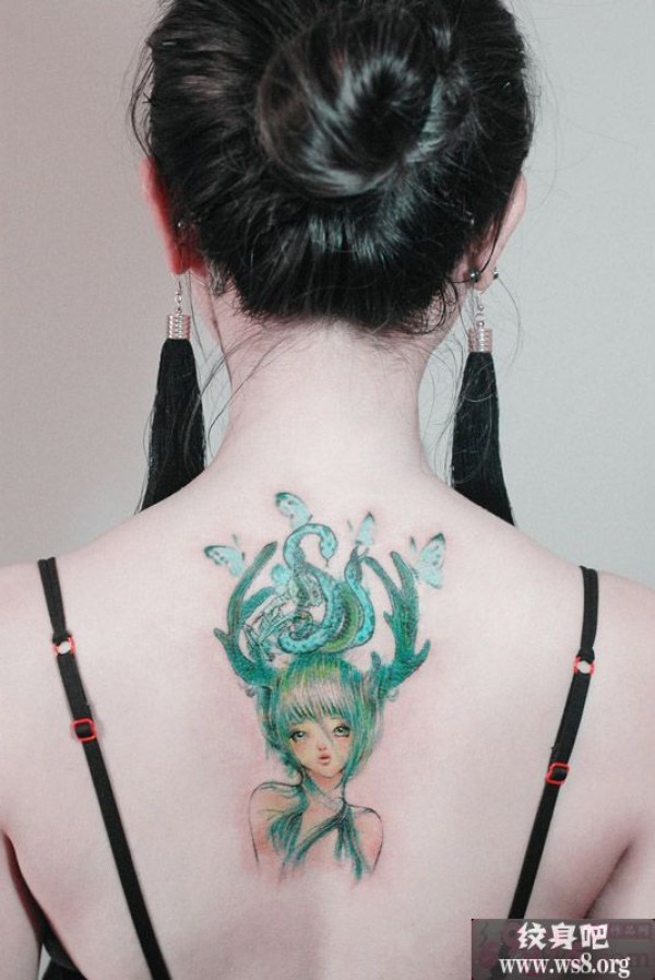 唯美绿色美杜莎背部图案_后背纹身图案大全_纹身图吧