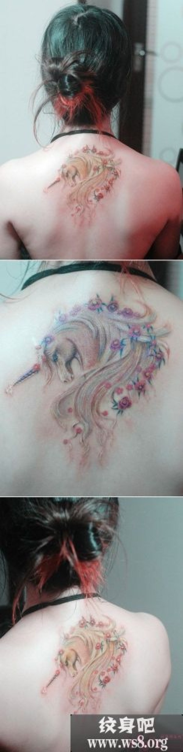 唯美粉色独角兽与花后背图案_后背纹身图案大全_纹身图吧