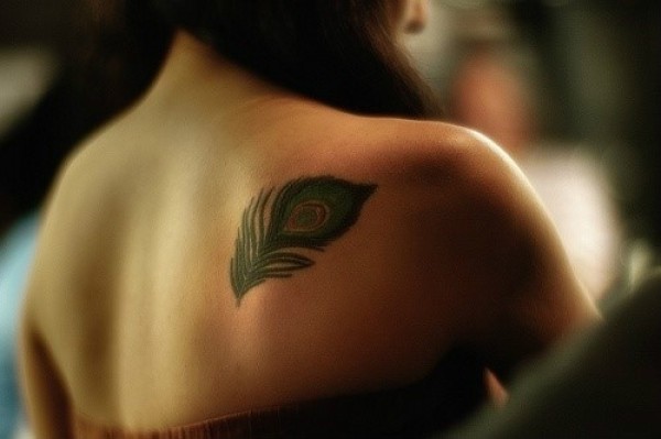 女性背部孔雀羽毛刺青_后背纹身图案大全_纹身图吧