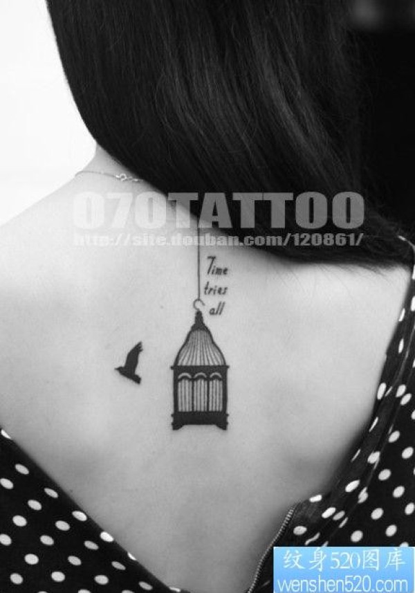 一幅潮流的女孩子背部小鸟鸟笼纹身图片_后背纹身图案大全_纹身图吧