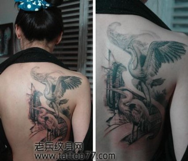 美女背部经典的白鹤纹身图片_后背纹身图案大全_纹身图吧