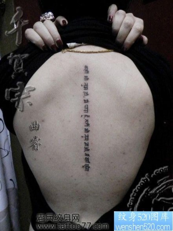 流行时尚的美女背部藏文文字纹身图片_后背纹身图案大全_纹身图吧