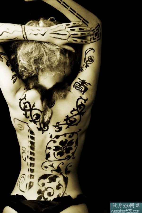 美女后背上黑色的字符图腾纹身展示_后背纹身图案大全_纹身图吧