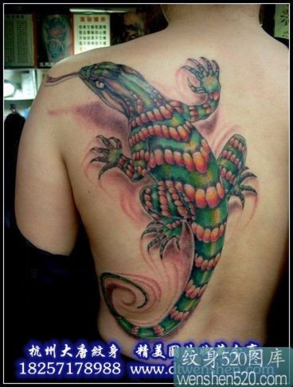 后背上色彩斑斓的大蜥蜴纹身作品_后背纹身图案大全_纹身图吧