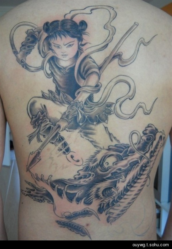 霸气男子背部哪吒驾龙纹身图片_后背纹身图案大全_纹身图吧