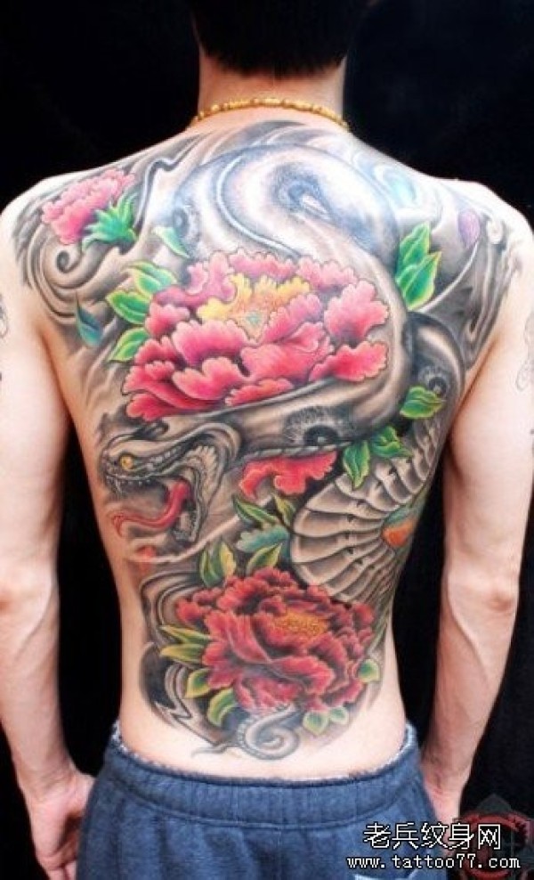 个性男人背部艺术莽戏牡丹纹身图片_后背纹身图案大全_纹身图吧