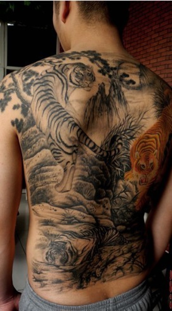 男士背部超酷的三只老虎纹身图案_后背纹身图案大全_纹身图吧