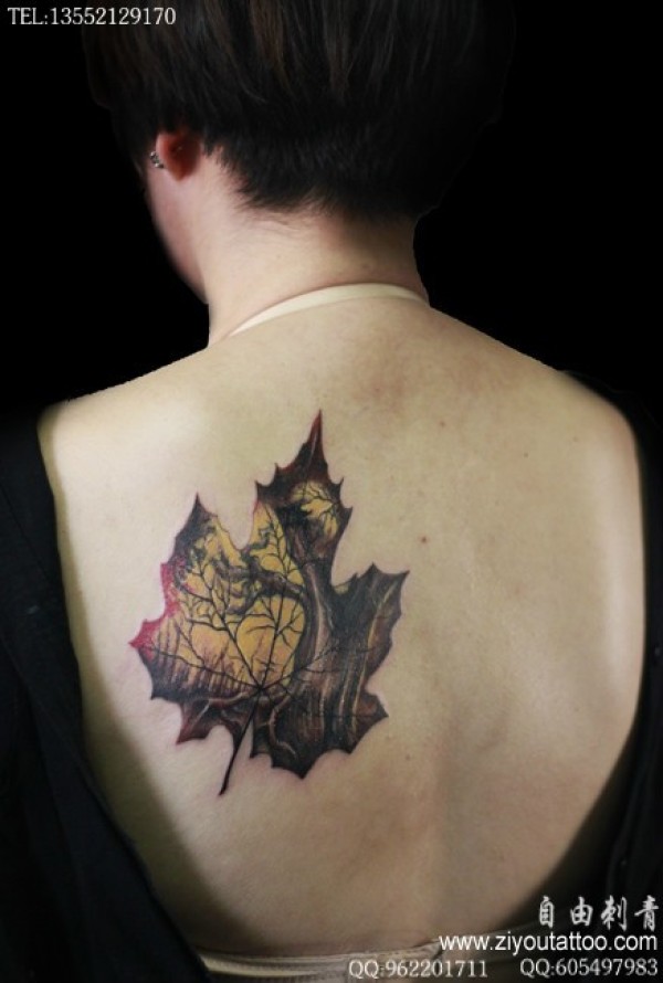 女士后背彩色个性枫叶纹身图案_后背纹身图案大全_纹身图吧