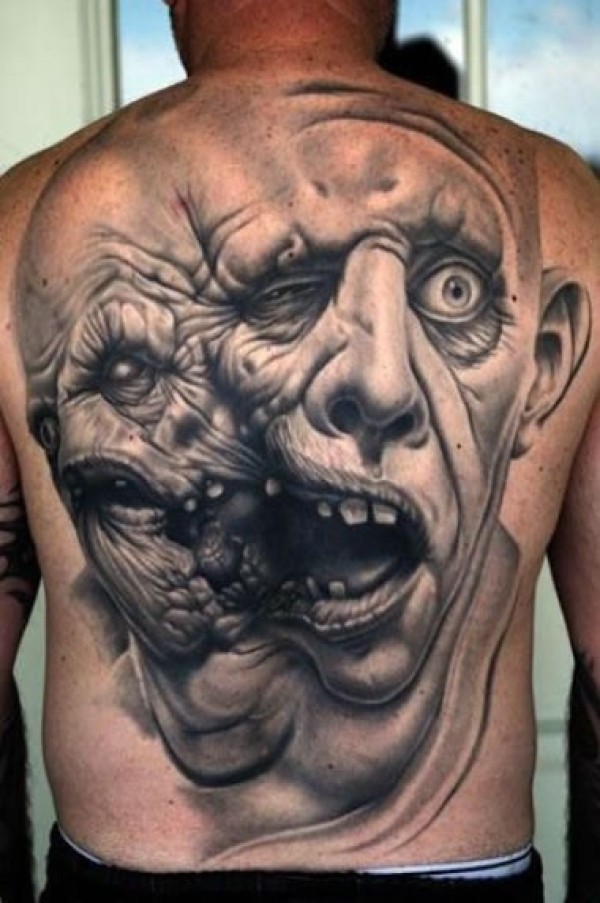 后背超级怪异的双脸人纹身图案看到这样的纹身_后背纹身图案大全_纹身图吧