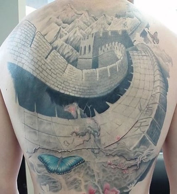 后背长城图案纹身,感觉大气啊_后背纹身图案大全_纹身图吧