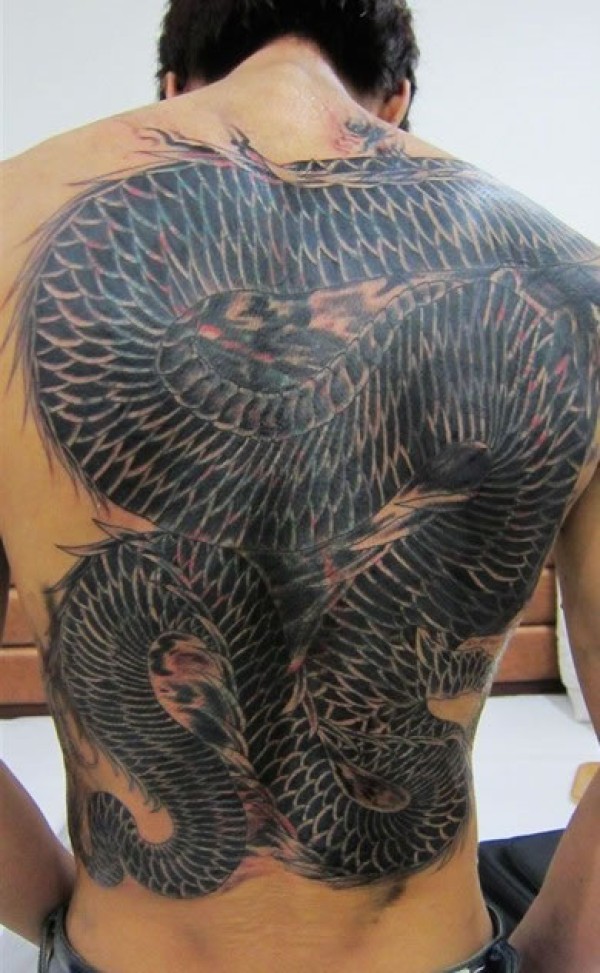 满背黑体巨蟒纹身图案欣赏_后背纹身图案大全_纹身图吧