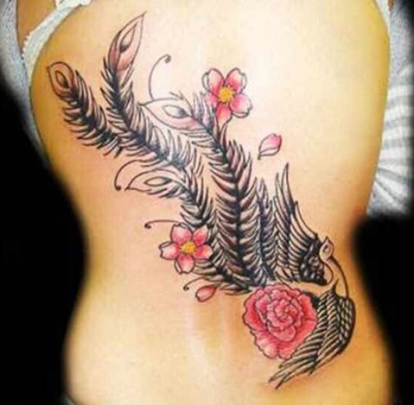 女生后背上轻扬的羽毛纹身图案组合花朵的羽毛_后背纹身图案大全_纹身图吧