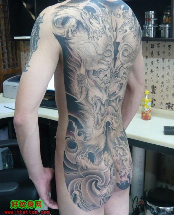 北京强子纹身作品之传统满背黑白龙头纹身图案_后背纹身图案大全_纹身图吧